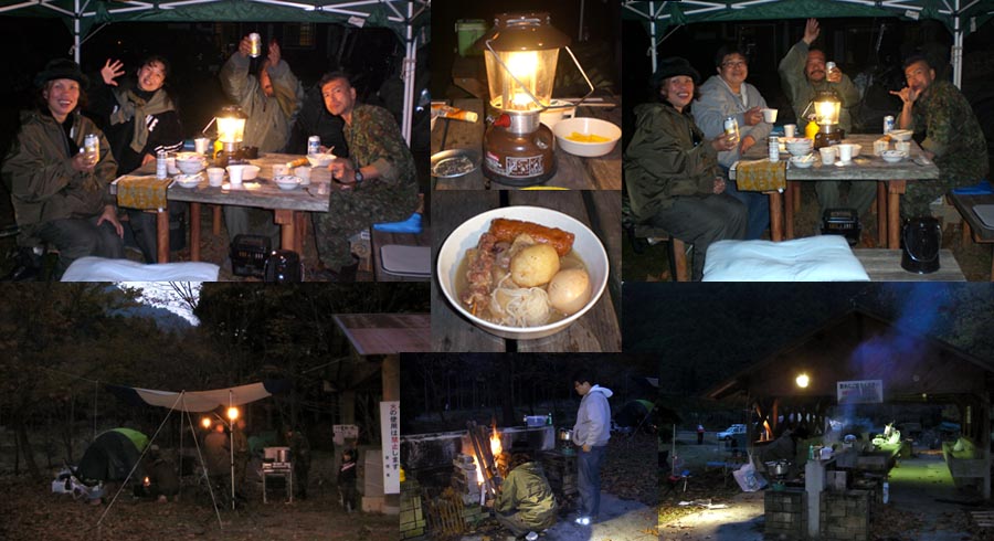 当日までに全然用意してなかったので、前日の夜に荷物だけ積んで、それもランタン、ストーブ類カセットガスタイプの物ばかり・・ 理由は、楽であるから・・(笑)、一緒に行った友人は、ガソリンランタン、ストーブ類を持ってきてくれました。テントも持って 行きましたが、100Vコンセントもあったので大変良かったです。最初から分かっていれば、荷物が少なくて済んだのに〜・・・・ 今回、事務局(竹谷氏の設営テント)にご一緒させて頂きました。当方知人のおばはん特製のおでんを食いながらみんなで 盛り上がりました。夕方到着したマイミク 松宮氏も参加で一段と楽しく盛り上がりました。