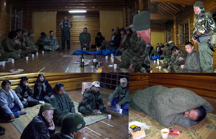 今回、参加者も結構多かったのでミーティングにも参加してみた。みんな順番に自己紹介をして、その後は、そこらじゅうでジープ談義やら、 酔っ払ったおっさんの無限ループ話しやら?始まっていました。当方は外へ行っても寒いので、そこで各自の話声を聞きながら、ワインを飲んで おりました・・・・(爆)その後、テントサイトでもう一度盛り上がって最後ミーティングルームで寝てしまいました。テント張らなくて良かったので大変楽でした・・・へへへへへ