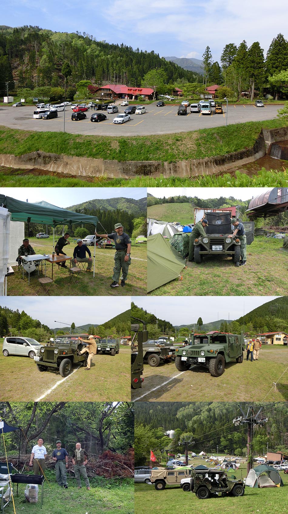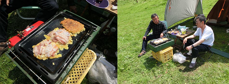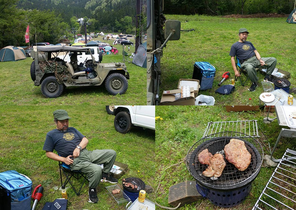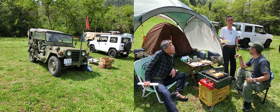 会場へ付いて、ウッディパル余呉の事務所でお金を払ってから赤子山スキー場内へ 一般客多く、どこに誰がいるのか不明、ゲレンデ上の方にサンドベージュのハンビー発見!!この車両は 大西氏の友人が買ったと言う車両と思ってそちらへ移動。その通りだった。 その奥で、当方は泊まる事に、荷物降ろして昼飯の用意。いろいろやっていると昼前に・・・平和堂で買ってきた 肉を焼きビールを飲んでいると、大西宅で焼いた美味しいお好み焼きの差し入れがありました。 それを頂きながらの談笑???内容がなぜかしら年金の話。そして話題が変わっても健康の話・・ やっぱりみんな年寄りになった証拠ですね。あと何回おあいできるでしょうか?