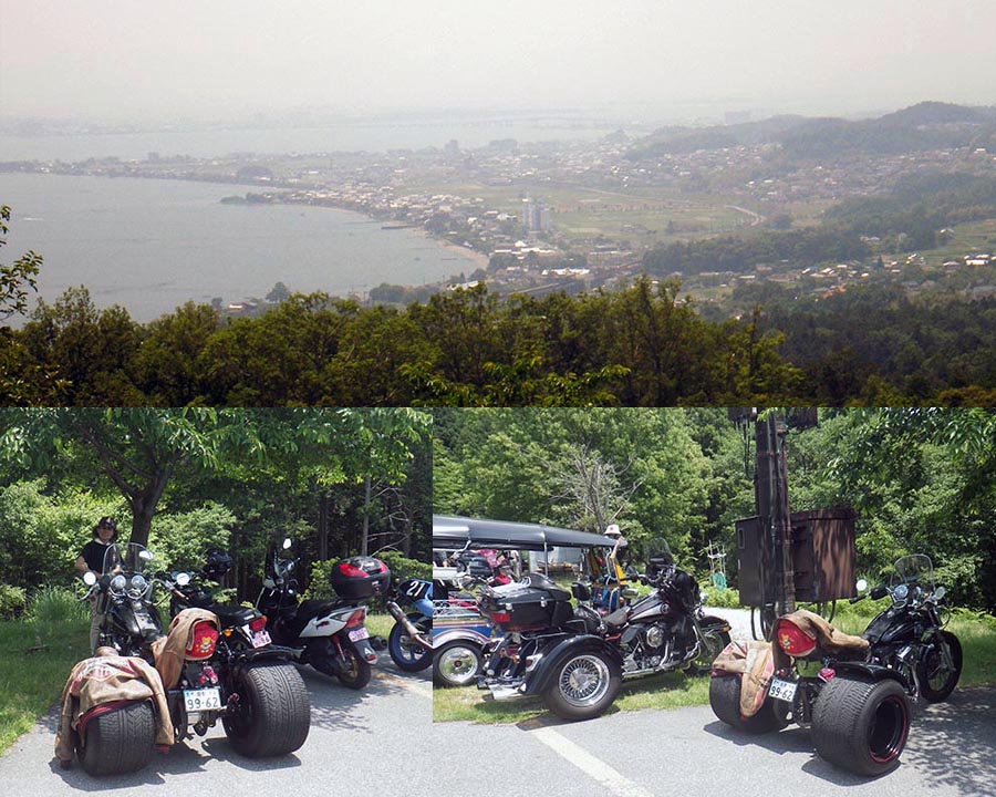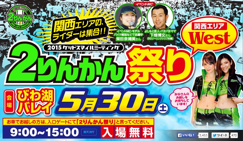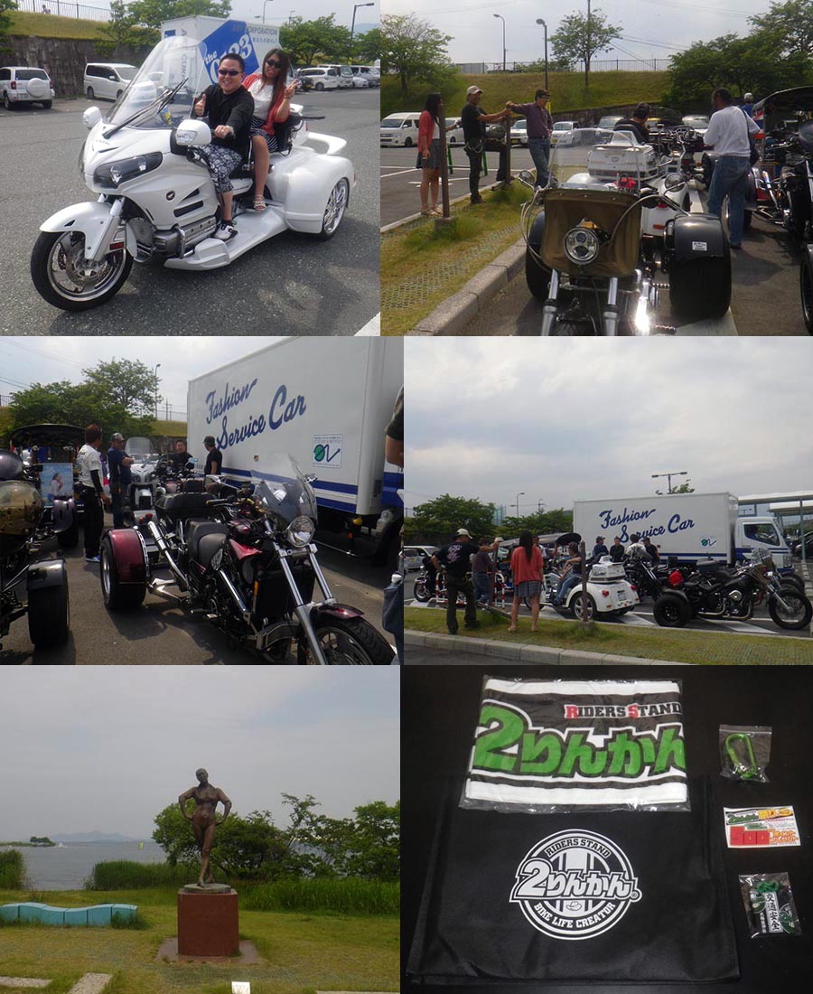 | 2015/5/30(土)晴れ 毎年、びわ湖バレイで開かれる2りんかんのイベントに行ってきました。 午前9時30分にコメプラザ集合だったのですが、会社のおばはんが行きたいと言うので 当方は、単独で直行する事にしました。家を午前7時30分ごろに出発。 会場到着は、午前8時30分ぐらいだったが、もう凄い人でした。 それから並んでいると、どんどんバイクが上がって来ます、直ぐに列が延びて延びて・・・ 結局、開催時間を前倒しして午前8時45分ごろから始まりました。入口で2りんかんギャルから粗品をもらって入場。 いろいろなショップが去年同様に出展していました。それを見て廻って、またトライクを停めたところへ戻りました。 そこでビッグブリッジのお客さんで去年の夏にツーリング行った時の人と会いました。その後仕事だと言っていた福井の オッサンが休みを取って登場。あとは続々仲間と再開。大阪のタケさんも岸和田から電話がありこっちむけ移動に・・・ |