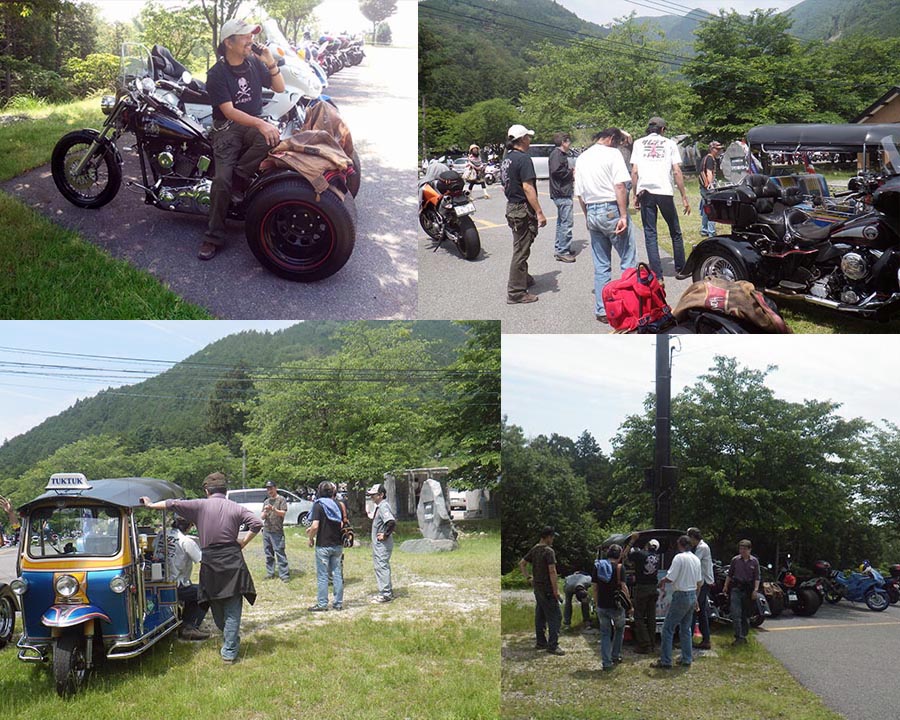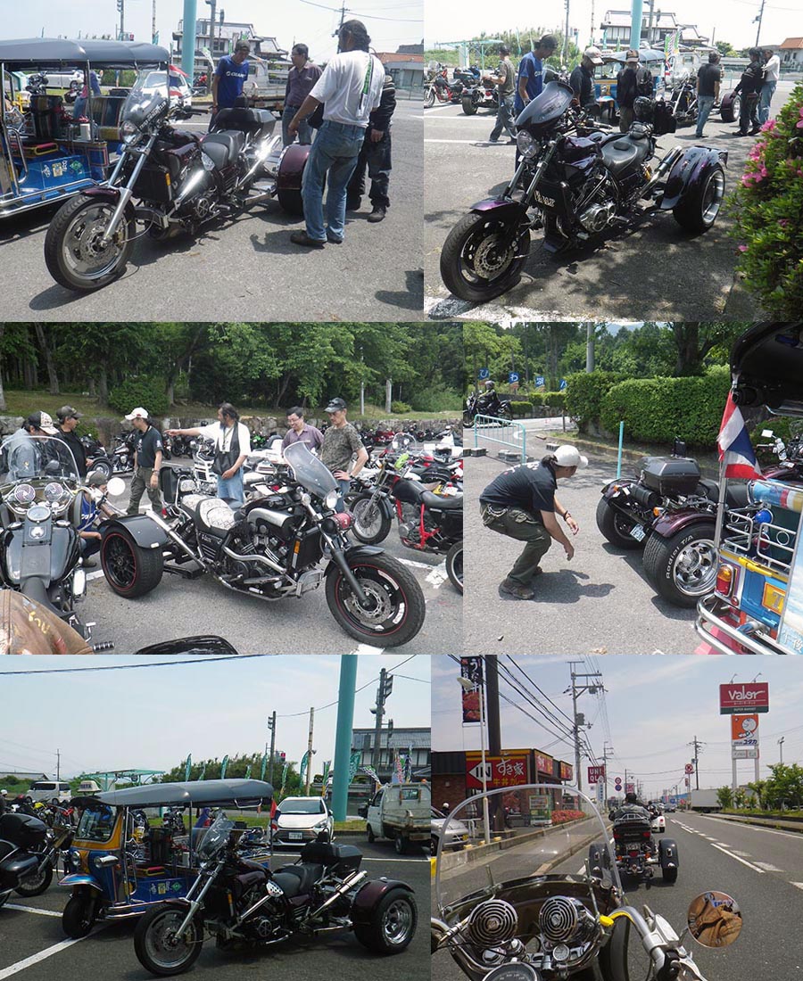 | 下りてガレージでタケさんと合流。談笑していたら国道から二台のトライクが・・・yamaさんとHokuto(改)さんがトライクで 登場、二人も入れて、またまたトライク談義。みんなで喫茶店へ行く事に。会場でチラシを配っていた店へ行く事に。。。 行ったら休み、今日はイベント参加につき休みだって???笑わしてくれますね〜 ハシーさんの提案でコメプラザへ行く事に決定。コメプラザ向け移動開始。 |