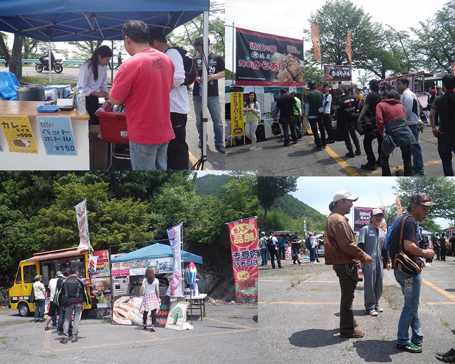 | 腹が減ってきたので少し何かを食いに・・・当方は肉巻きおにぎりのような物を食いました。 みんな色々食っていましたけど・・・ゆっくりしてから、またトライクを停めた場所にもどり 談笑タイム。タケさんから電話があったが、びわ湖バレイのゲートで会場ガレージ満車で 入れてくれないって・・・延々車の列。仕方ないので全員下りることにした。 タケさんには国道161号線沿いのガレージで待ってもらいました。 |