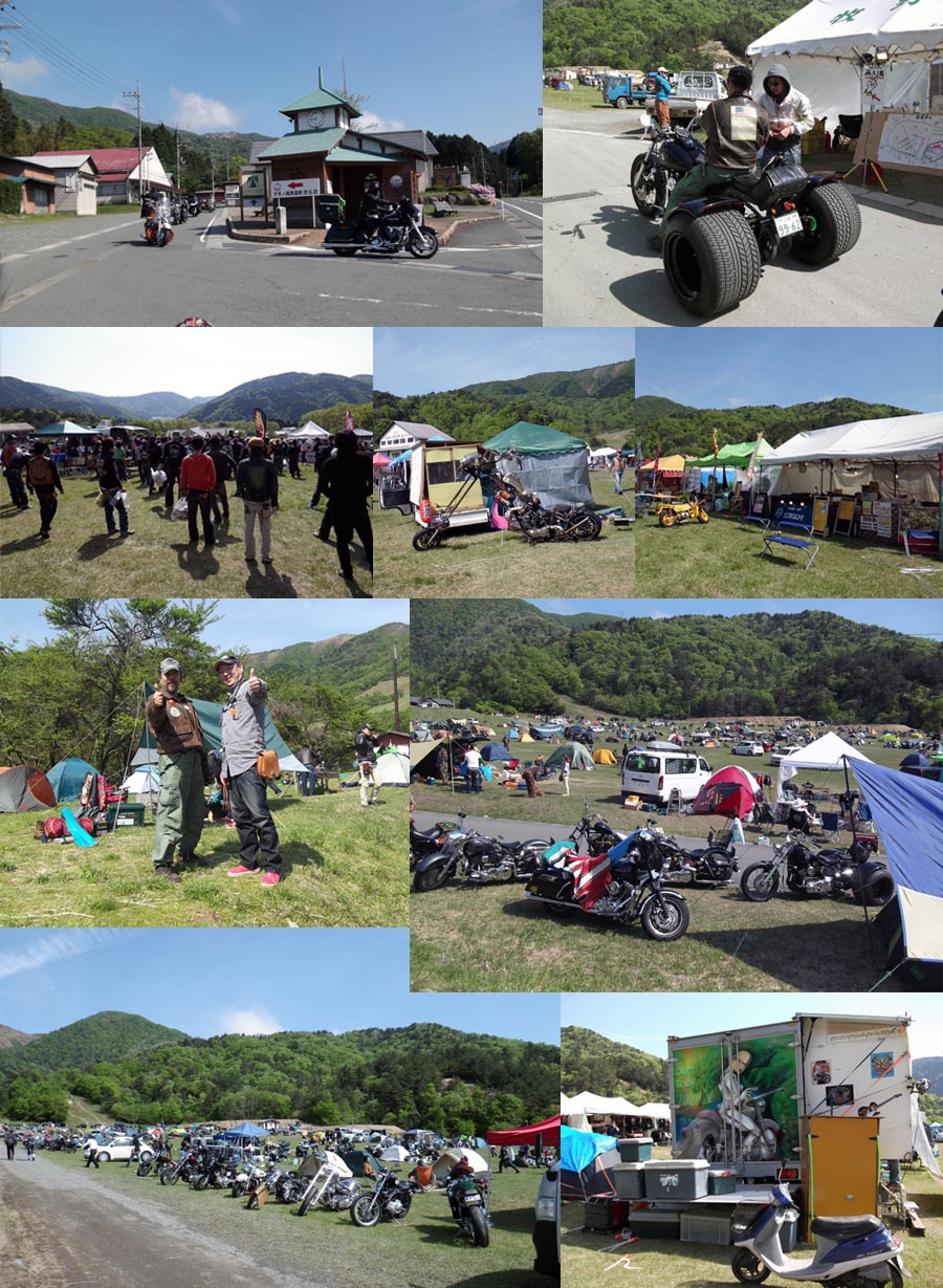 | 会場へ到着すると受付で一人1,000円払いました。(日帰りは半額の様です)そして マイミクのかじさんがキャンプしている場所へ移動、前泊で行ってられたかじさん達と お会いできました。とりあえず会場をうろついてホームページネタの写真でも撮ってこようと 歩き回って戻ってくると、集合写真を撮ると言う事でみんなが動き出したので着いて行きました。 |