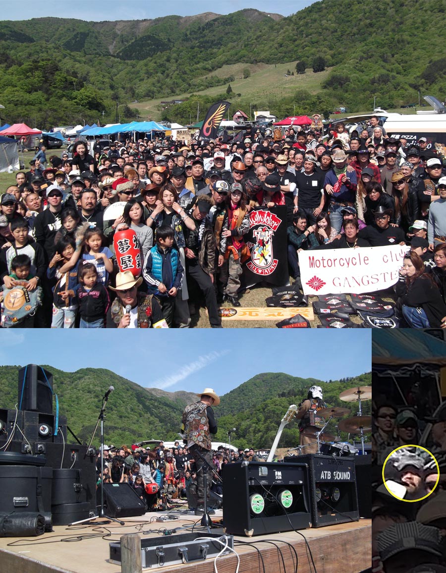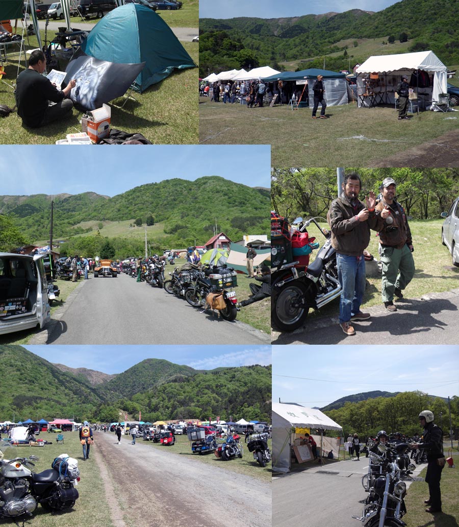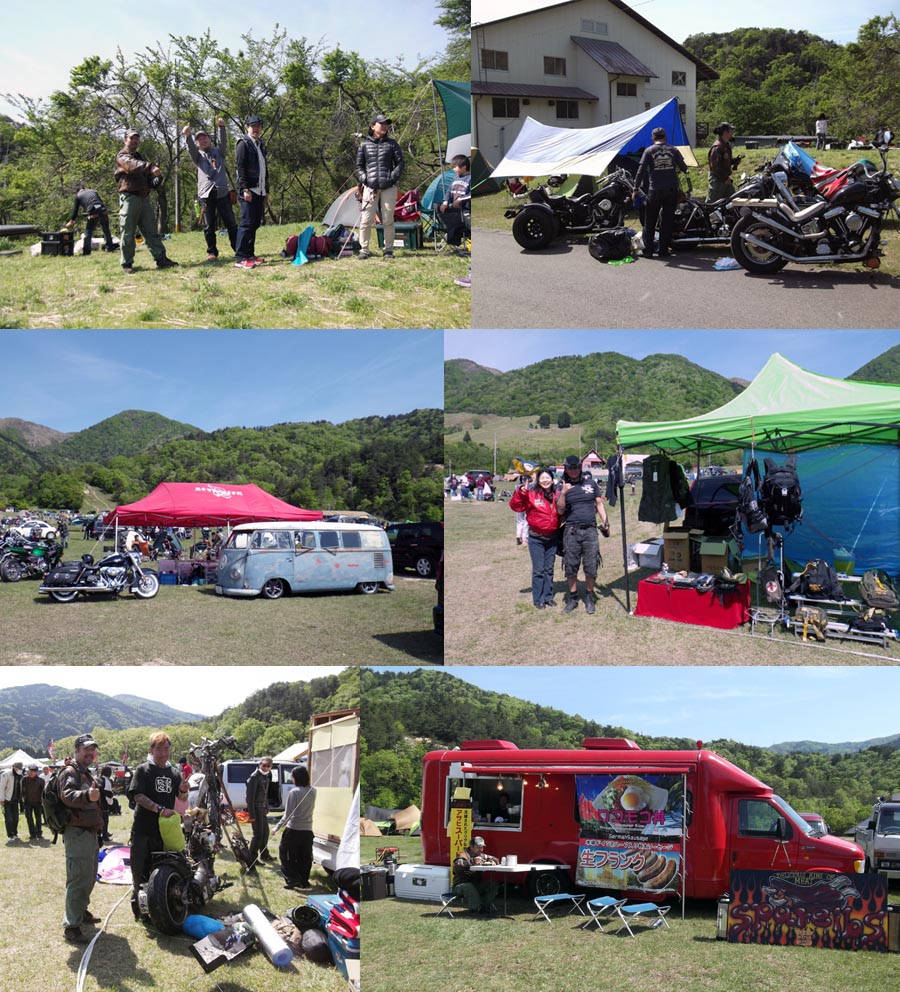 | 集合写真撮影が終わり、かじさん達のキャンプサイトへ戻ったのですが、朝飯も食ってきてなかったので 何かを食いに・・・その途中でカバン等を売っているテントを発見、当方の好きな色(OD)のリュックが あったので購入しました。ヤフオクでガスマスク等を売ってられるGASUMARUさんでした。嫁が一緒に撮ってくれと言うので撮影 しました。宜しく。 GASUMARUさんのホームページは現在リニューアル中で繋がらないようなのでリンクは割愛しておきます。そして歩いているとかなり目立つバンが・・・ これに決めました。ロコモコ丼、美味かったですよ〜大阪から来ていると言ってました。格好良かったです。マイミクのサトさんにも会えました。エイリアン健在でした。サトさんは、前日から焼き鳥の店を出店されていたようです。本日は撤収のみ? |
