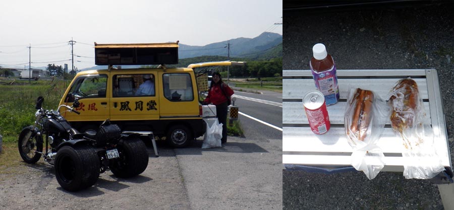 | あとはのんびりと走って帰路につきました。途中爆音と共に数台のカスタムハーレーが 当方のトライクを抜いていきました。(多分海人さんの仲間では?)そして久々に 高島市の白鬚神社付近で出している風月堂のホットドッグを食べました。 やっぱり美味かった。ゆっくりしていると、海人さんと連れのルバコの方がクラクションを ならして前を通って行きました。帰ってからみんなでバーベキューをしたらしいですが??? |