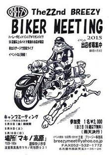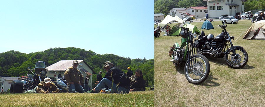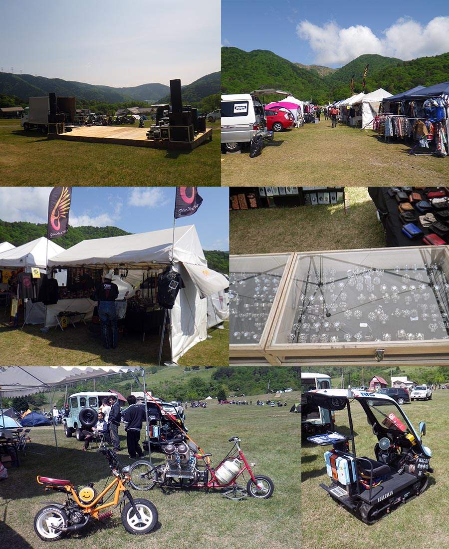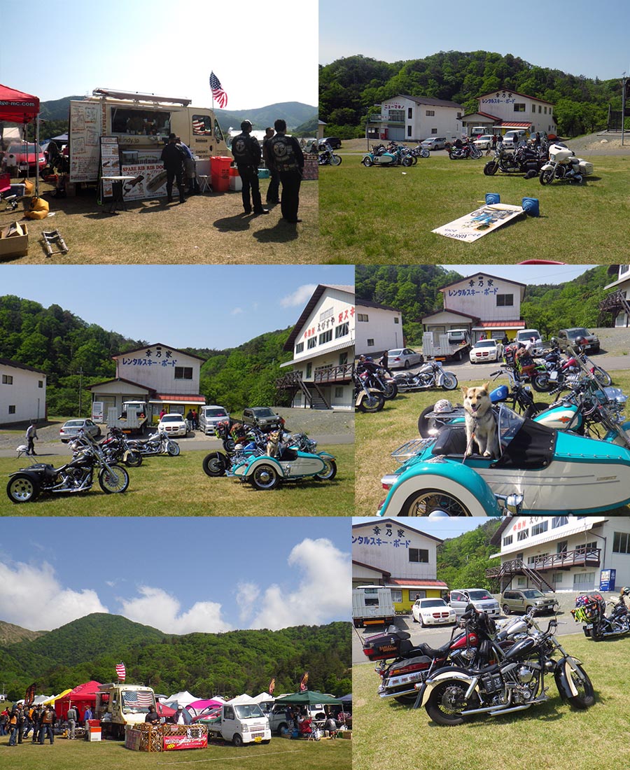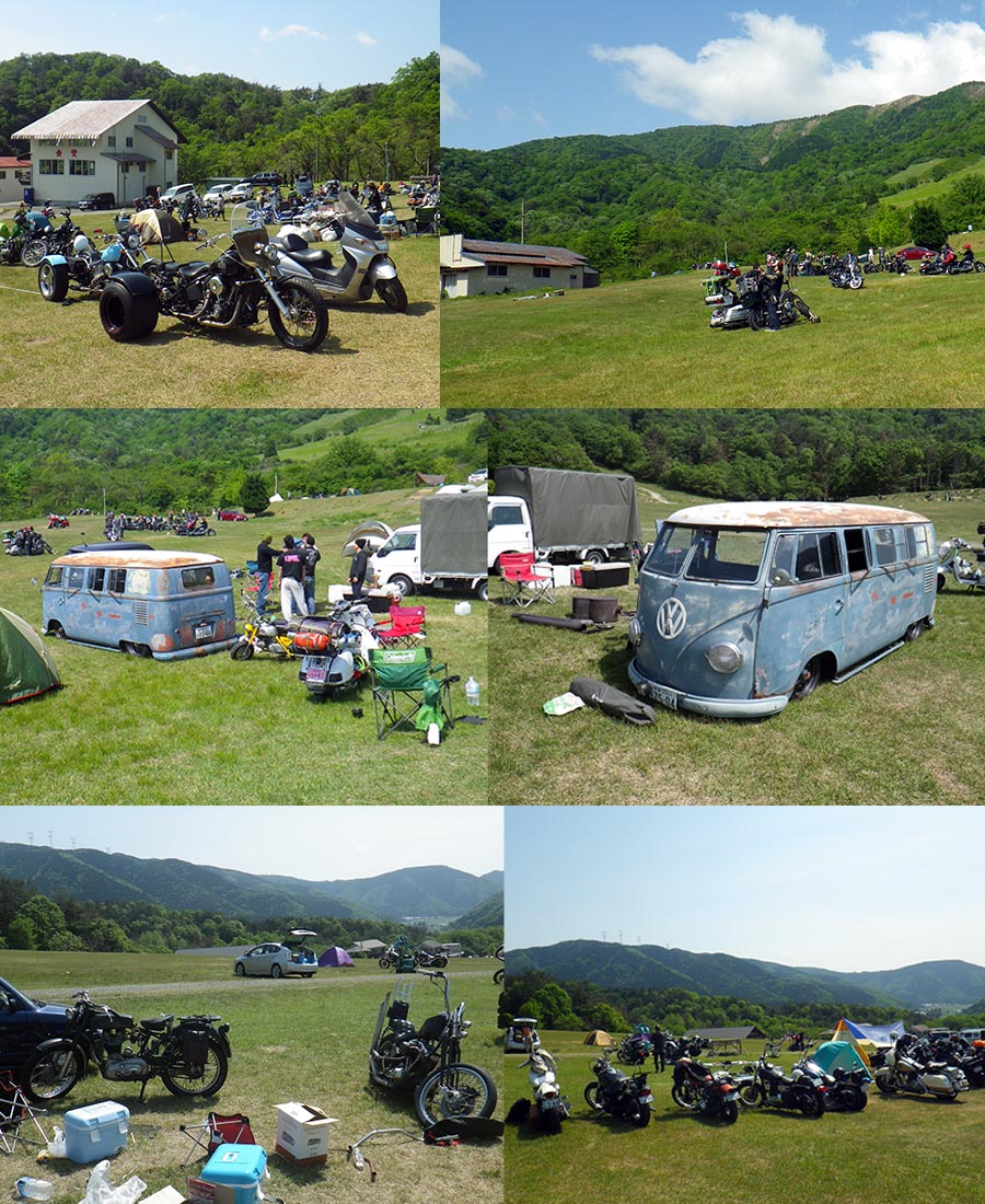 | そして無事にBREEZY バイカーミーティング会場のマキノ高原へ 到着、入口で1,000円支払ってステッカーももらいました。 今日は、天気も良くて結構まだ帰らずに残っている人も居たし、 当方らの様に、まだ来る人も結構いまいた。 ぶらぶらしていると、ひろさんに、福井のおっさんから連絡が 入った。ところで今どこにいるの〜?会場に来ているんだけど・・・そのような?連絡が入った。 それから少しして福井のおっさん歩いて登場!!理由は、直ぐに会場を出るのみ入場料はちょっと・・・ 納得です。ここで4人になりました。そしてまたゆっくりして11時も過ぎたので 昼は??? サッチャンでBBQと決定!!とりあえず会場をあとにしました。 |