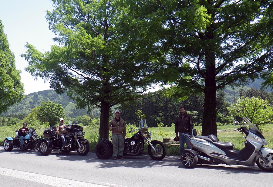 | 2015/5/10(日)晴れ 毎年、マキノ高原で行われている BREEZY バイカーミーティング今年は、 2015年 5月9日(土)〜10日(日)だったが、 いつものように日曜日日帰りで参加した。 去年より多かった感じだった。 とりあえず誘われたので行く事にした。 集合場所は、琵琶湖大橋コメプラザ午前8時。 早めに家を出て京都東IC近くのガソリンスタンドで ガソリン補給。セルフスタンドの練習(笑) そして西大津バイパスで真野まで向いましたが あまりにも早く到着しそうだったので雄琴でおりて 国道161号線で待ち合わせ場所であるコメプラザへ向いました。 信号にもひっかかっても到着は7時25分ぐらいだった。 まあそこでぶらぶらしていたら、海人さんとひろさんが7時40分 ぐらいに到着。缶コーヒーを買って暫しトライク談義。 時間も8時過ぎになったので出発する事にした。 バイパスで高島方面へ、道は一般道も空いていました。 マキノまで入って、みんなが記念撮影等するメタセコイア並木で お決まりの記念撮影をしました。小さな三脚で見えにくい液晶。 まあ何とか撮影できました。 |