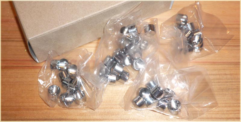 | 2009年12月30日(水)先日、ネットで購入したクロームボルトキャップ 1/4インチ 50個セットを取り付けて見た。単にキャップであるから誰にでも出来る 簡単ドレスアップと言うことです。画像より実物は、ドレスアップの価値ありって言う感じになりました??? |