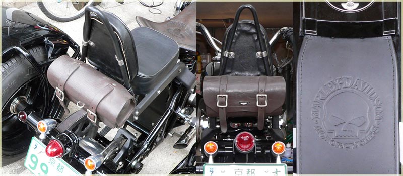 | 以前ヤフオクで購入していた物を取り付ける事にしました。 画像左:本来、一人乗り仕様にした時にサドル後ろに取り付ける予定だった本革製のツールバッグをシーシーバーに取り付けました。 フロントシートの色と調和して以外と格好良いと自分では思っています。画像右:純正のそっけないプラスチックカバーが付いていたので ハーレースカルコレクションタンクカバーに変更しました。 |