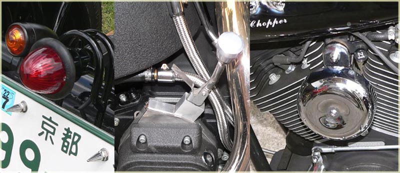 | 画像左:ナンバープレートのボルトをステンレススパイクボルトに交換しました。画像中:萬羽製のバックギアのストッパーの バネ取り付け間違いとビス老化があったので、ホームセンターでステンレスビス、ナット、ロックタイを購入。バネ正規取り付け修理しました。ストッパーの 位置を少し変更(マフラー回避) 画像右:ハーレー純正のホーンカバーの形が嫌いでキジマ クローム ベル型 ホーンカバーに交換しました。画像はありませんがヘッドライトコントロールの為に 半導体ヘッドライトスイッチ組み込みしました。 |