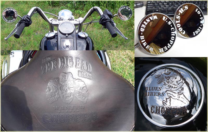| チョッパー奈良で注文しておいたミラーが届いたので取り付けた。 元々右ミラーしか無かったので、今回左右取り付けたおかげで運転もしやすくなった。チョッパー奈良オリジナルのサンドブラスターによる 文字入りである。他の画像は、チョッパーオリジナルパーツを使用していると言う画像です。 |