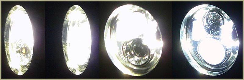 | 取り付けは単に交換するだけなので簡単です。取り付けてテストしてみた。家の前の道なのでイマイチ分かりにくいが上画像が交換前のハロゲンヘッド、ローとハイ。 下画像が今回交換した純正LEDライト、ローとハイ、実際にはかなりの差がある。そして横幅が半端じゃ無いほど広い。 |
