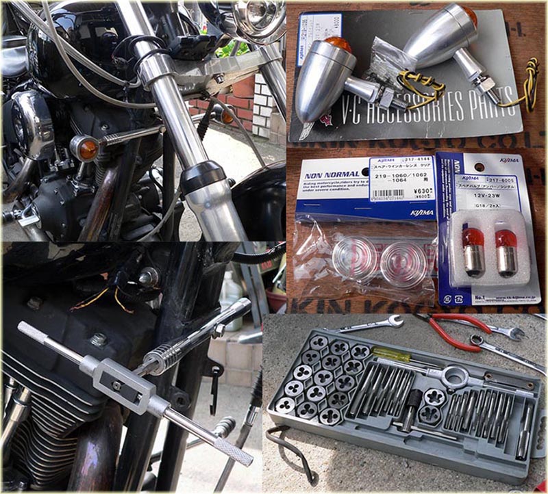 | 2014年4月12日(土)以前、前ウインカーが壊れたので家に有った物を付けていたが、今回ヤフオクで以前付けていた物と同タイプの ウインカーが出ていたので落札した。そして予備パーツで購入しておいたクリアレンズに替えようとしたが微妙に大きさが違う。 合わせて見てもわからないぐらいに・・・・もちろんメーカーは同じが、型番が違うようである。 それで仕方なくそのまま使用する事にした。現在付いているバーを使用しようと思ったらネジサイズが違う・・・・・ 仕方無くタップを切りなおした。 |