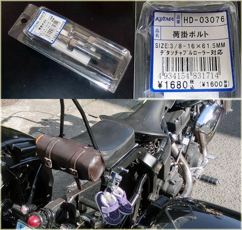| 2014年5月25日(土)以前、後ろの座席を留めるボルトの山がいかれて違う物を入れていたが見た目にイマイチだった。 先日、ヤフオクでたまたま見つけたキジマ製の荷掛ボルトが出品されていた。未使用との事だが???まあそれはどうでも 良かった。価格も300円だったので落札して取り付けてみた。まあこれはこれで良いのでは?自己満足。 |