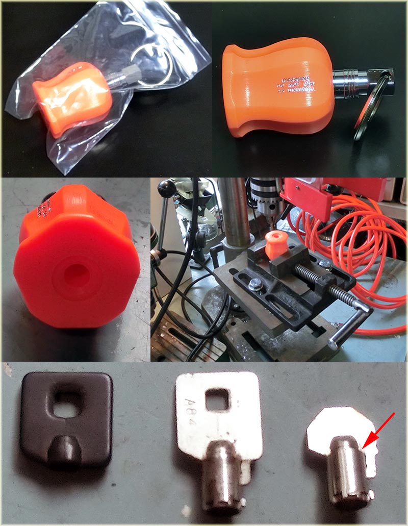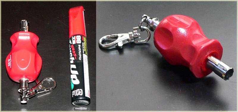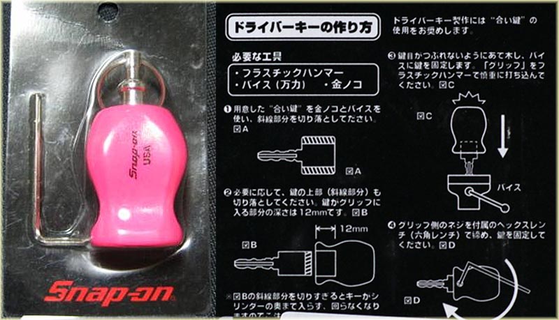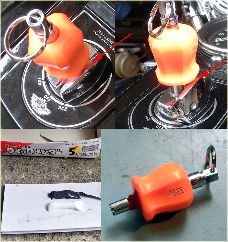 | 2014年6月22日(日)昨日の夜に届いたMAC TOOLSのグリップキーホルダーを使ってトライクのキーを改造しようと思っていた。さて作業開始・・・本当は画像のSnap Onの製品が欲しかったのだが 廃盤になっていてプレミア物で価格が高かったのでやめた。しかしSnap Onのはキーに使用するようにある程度改造されている。ところがMAC TOOLSのは単なるドライバーのノブに クイックリリースが付いただけの物である。イマイチ・・・そして今日元のキーをグラインダーで削りちょうど良い部分までバッチリできたので現物あわせをすると多分Snap Onより大きいのだと 思うが?ハーレーのキー蓋に当たってダメ、とりあえず当たらないところまで出してエポキシ系接着剤で固める事にした。本当は矢印部分で固定するのが一番格好良いんだけどね。 まあ仕方ない。Snap Onのミニキーホルダーはまだ安く入手できるがキーホルダー部分がやわく信用ならない?まあとりあえずガレージにオレンジ色の塗料があったのでエポキシ部分に綿棒で 塗っておいた。 |