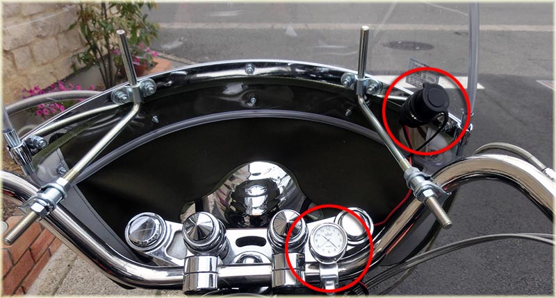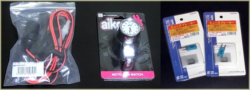 | 2014年6月6日(金)先日、風防を付けたのでハンドルにいろいろつけても見えない?だからシガーソケットを付けてみた。(まずは使いやすい位置にセットしただけ)これで電源も取れるし、 逆から充電も出来るようにバッテリー直で配線した。もちろん途中にヒューズは入れてますけどね(笑)、そしてツーリング中に時間を見るのに夏場は良いとして秋冬はどうしても 袖がめくれないので不便と言う事でハンドルに時計を付けてみました。 最後に先日、仲間の海人さんに教えてもらったブレーカー式のヒューズ。これを二個購入して取り付けました。 |