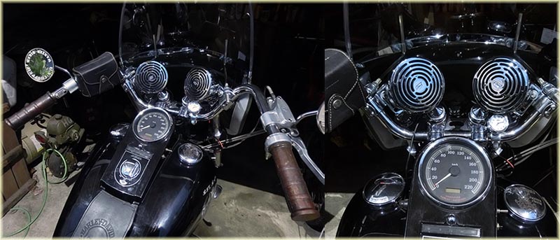 どちらかと言うとハンドルにごちゃごちゃ付いたのが嫌いなのですが、だんだん風防以来増えてきています(笑)しかしスピーカーは下に付けました。 いつも後ろや下に付けて全然聞こえなかったけど、これは凄いやっぱり本家の品物で尚且つ高級な価格、物凄く大きな音で鳴ります。大きな音で鳴らす気はありませんが・・・ |