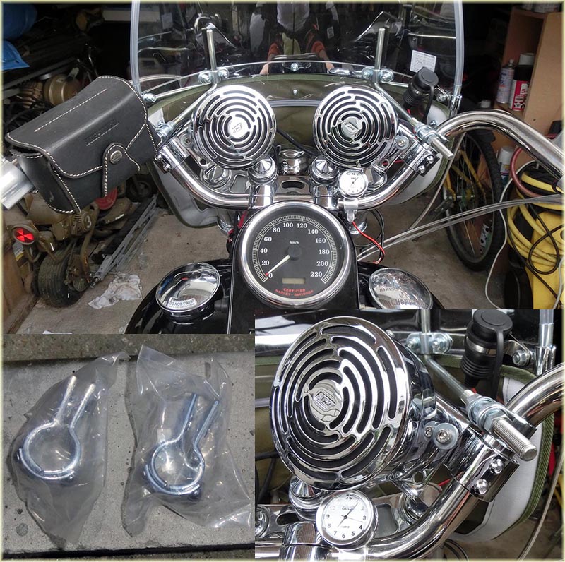 | 2014年6月21日(土)トライクの車検があがってそれまでにハンドルに付けていたスピーカーのクランプを注文しておいたものが到着した。 それは、形は同じだが1インチ用の物である。以前の物は旧トライク時代に使用するために買った 1.25インチ用の物だったので間にゴムを入れて固定していた。 今回は何も入れずバッチリ(当たり前だけど)です。 |