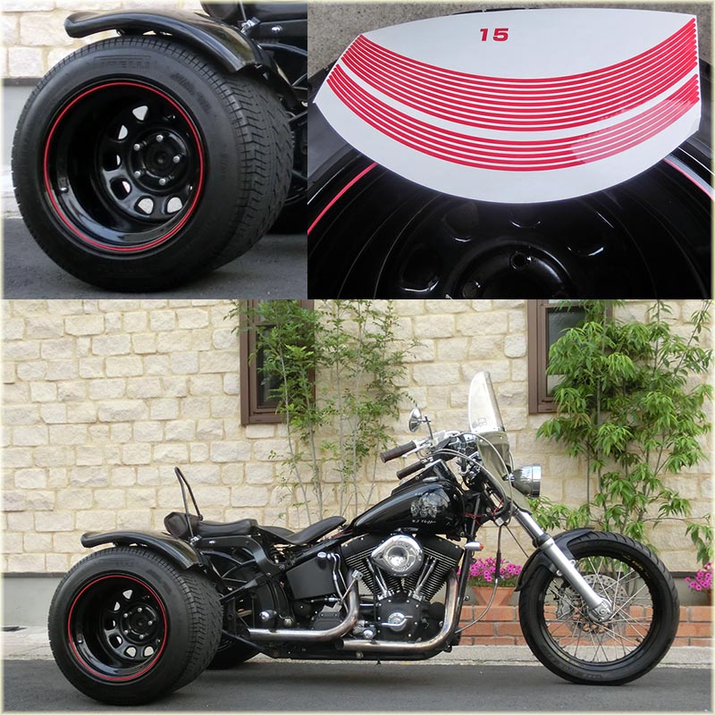 | 2014年6月15日(日)今日、ヤフオクで落札した送料共で500円弱のホイールステッカーが届いた。テスト貼りしてみたらこっちの方が良かったので貼りなおした。 こちらは3mmと前回より少し細い。色は前回のがオレンジっぽい赤、こちらは赤っぽい赤なので気に入った。ただ3,5mmの方が綺麗に貼れた。こちらは少し歪んだりする(細いせいなのか?) まあ目立つほどでは無いのでよしとした。 この大きさの画像では、違いがわからないかも? |
