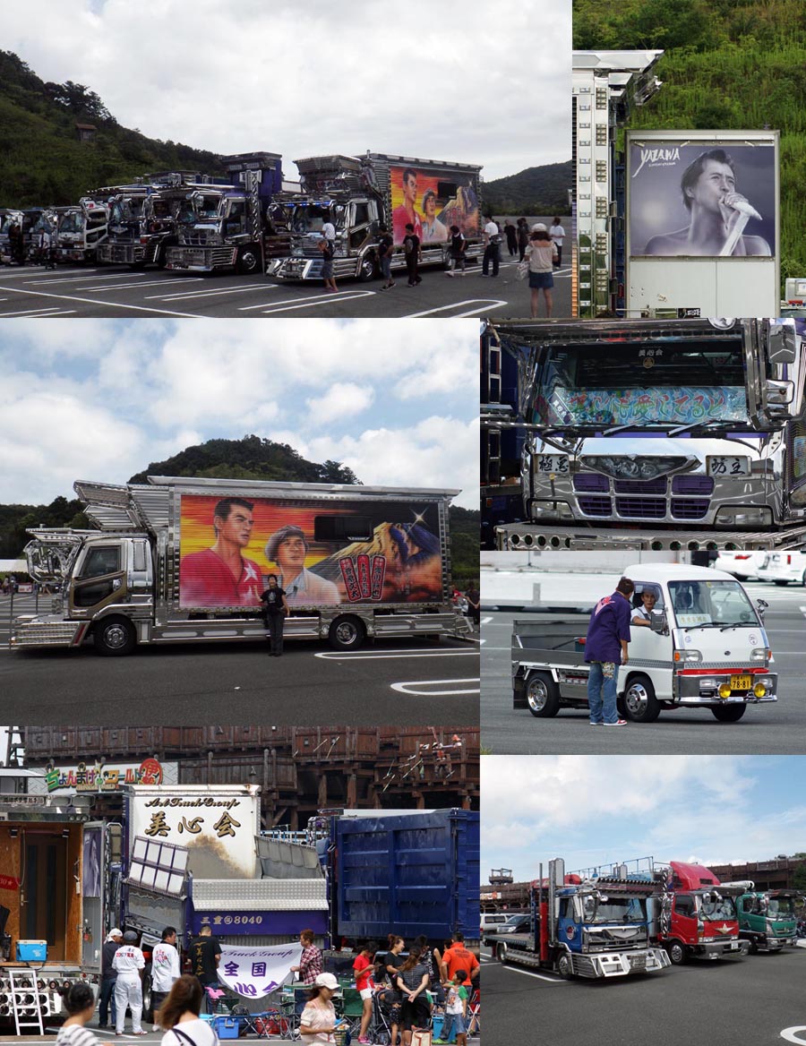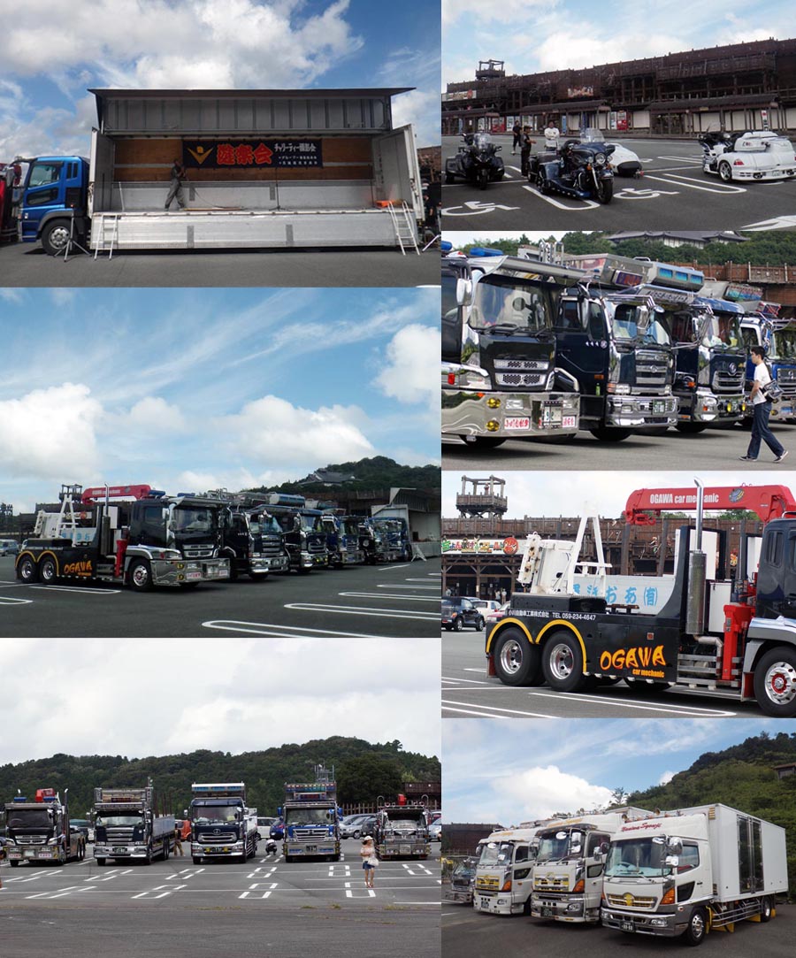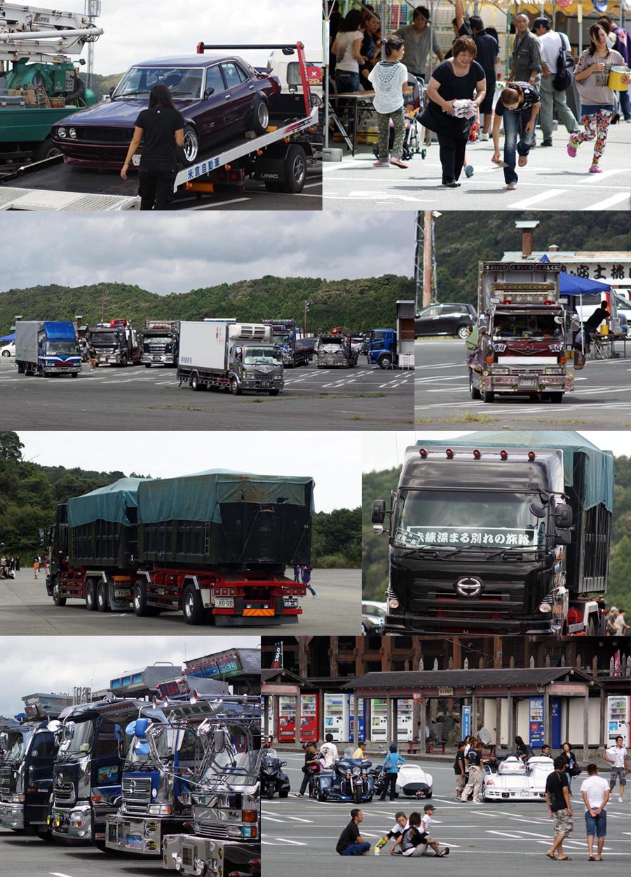 | 昨日、名古屋でオートレジェンドを観にいき、もう帰るのがじゃまくさいので 途中で泊まった。そして16日(日)伊勢方面へ来たけれど何も無くコースを変えて帰る予定だったが、 それでは、イマイチもったいないので、 [ 伊勢安土桃山文化村 ]へ行ってみることにした。 そちらへ向かう途中、いやにトラックが多い道だな〜って思っていたら。途中でカメラ小僧が・・・ かわいい軽トラ発見、思わず撮影してしまいました。そしてガレージ到着。 奥側のガレージを見ると、まだ少しだったがトラックが集まってきていました。 トライクも(これ当方嬉しい)伊勢安土桃山文化村への入場料が激高?2,500円、有料部分含むチケットだったら3,500円だったので もうそちらはやめてガレージで開催されている 遊楽会 チャリティ撮影会を観る事にした。 嫁が、受付の人に聞いたら各地で同時開催しているとの事でした。 一応、撮影をさせてもらいゆっくりして帰路につきました。 |