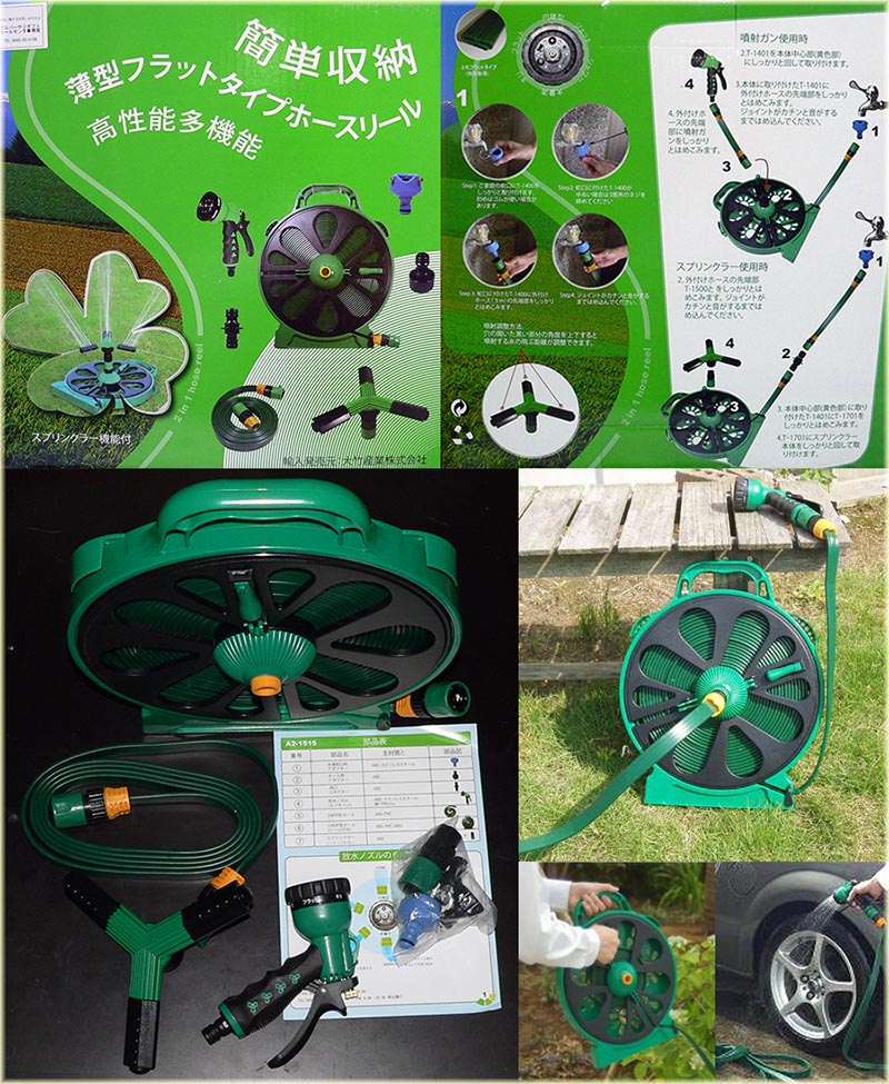 2015年6月27日(土)2013年に買った話題の延びるホースX-hoseは、数回使用でパンク・・・使い物にならなかった。 動画もアップしましたけどね(笑)今回、会社のポイントがあったのでそれでこのホースと交換しました。 梅雨時なのでまだ使用しておりませんが結構しっかりとした作りです。Made in Taiwanでした。 使わない部品(庭が無いので不要)なども付いていて充実のセットです。