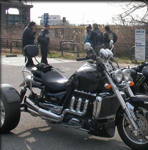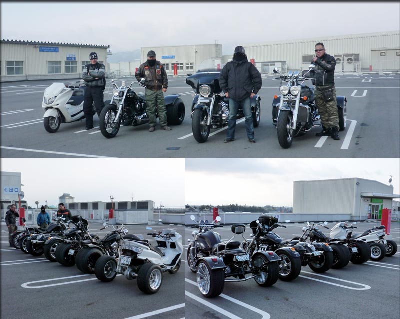 | 2010/1/2(土)mixi仲間のビワエンさんが、こうやんさんと約束をしていたので当方も急遽参加しました。 メッセージで連絡を取り、名神東IC出口付近で、こうやんさん、はまちゃんさん(4輪で参加)と待ち合わせ合流後、西大津バイパスにて 待ち合わせ場所のピエリ守山の屋上駐車場に向かいました。到着したら、ビワエンさんと、なんと先日お会いしたワル男さんも到着していました。 全員揃ったので、記念撮影やトライク話をして楽しんでおりました。こうやんさんとは、お会いするのも初めて、マシーンを見るのも初めてで 楽しく会話していたのに・・ガードマンが出てきて・・・・・・とりあえず気分悪いので移動!! |
