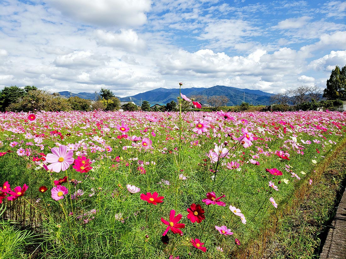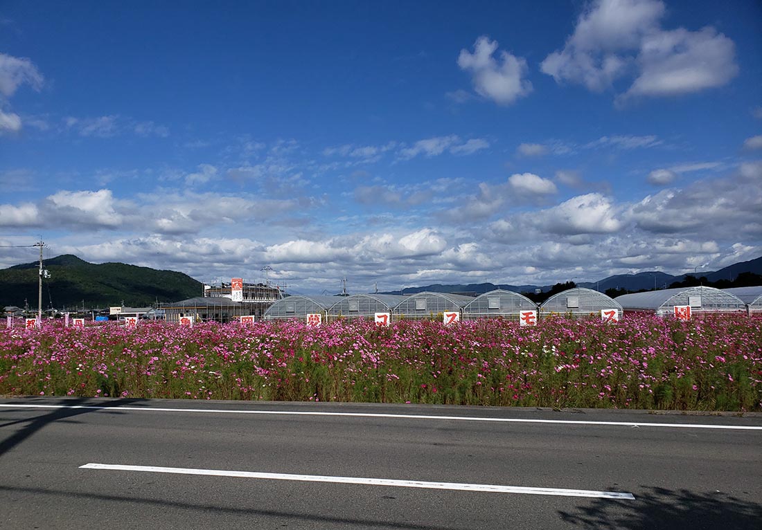 | しらずにうろうろ走っていたら大変綺麗なコスモス畑発見、規模こそ「夢コスモス園」には 負けるが密集していて大変綺麗でした。場所は、 【 亀岡運動公園プール 】の隣になります。 まず人が居ない。貸し切り状態。無料、ガレージあり(勝手においているけど)なにより景色も大変良い。今日のコスモス見学は ここで決まり。最高でした!!ゆっくりして適当に走る事に・・・ |