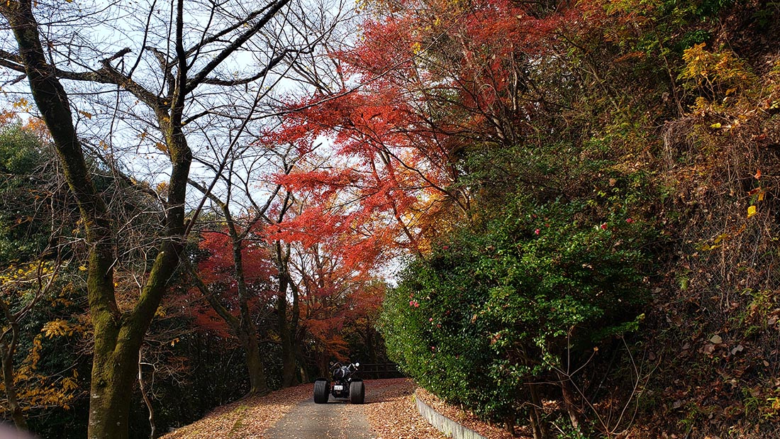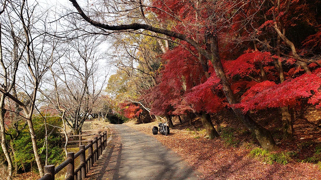 鳳凰湖展望台の道側に綺麗な紅葉があったのでトライクを 撮影してみた。やはり普通の日であり尚且つ朝に来ているので他の人は誰も居なかった。(mapA)この時の動画が下です。