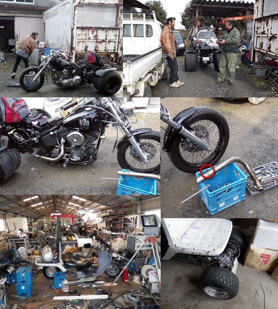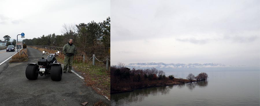 | そこから湖岸道路へ行き、琵琶湖大橋で湖西側へ行こうと思って走っていると、途中、 佐波江水泳場付近でエンジン付近からカンカンカランカランと金属音がするのでトライクを停めて点検してみると 前マフラーがガタガタしていた。ボルトナット緩みかと増し締めするもガンガンに締まった状態??? 底から覗いてみるとステーが折れている・・・・恐ろしや振動・・。。。この場所から近くで何か〜・・・・ マイミクの海人さんが・・即電話してみるとまだ寝ていたと言う事でした。申し訳ございません。相談したところ持ってきたら 直ぐに溶接ぐらいしてあげるとの事、第一サ●●アン向け移動・・・途中で道がわからず再度電話すると過激な運転の 日産マーチが海人さんでした。迎えに来てくれました。 |