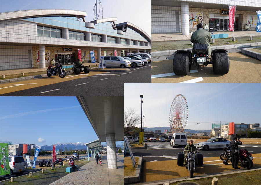 | 1月22日、嫁がトライクで何処かへ行こうとネットで滋賀県の [ アグリパーク竜王 ]を見つけ、そこへ行くと言うので朝から名神高速で行ってみた。 到着してみると道の駅風なところに駐車場がありトライクを停めて歩いて行って見たが客も居ない、手前のスワンのボートもやっていないし・・・入場料払って入る気も起こらなかったので即撤退!!下道で帰る事に・・・多分画像の直販コーナーには美味しい物なども販売していたと思います。実際にお客さんも来ていましたので・・でもそれが目的で来ていないので寄らずに撤退でした。 結局、嫁がトイレ行っただけの事でした・・・(涙) |
