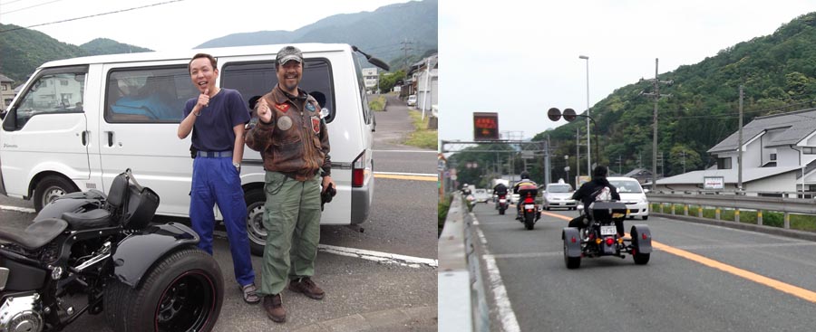 | 帰りは下道で滋賀県まわりから帰る事にし、腹も満足でゆっくり走っていると対向車が クラクションを・・・マイミクGiottoさんと遭遇!!仕事途中だったようですが路肩に 車を停めて少し立ち話をしていると、今度はトライクがこちらへ向かってくるのが見えたので 道路側へ行ってみると、偶然にもマイミク丸装さんとお仲間がトライクで通過!!多分方向から するとツーリングからの帰路だと思われます。手を振って挨拶のみでしたが、 なかなか今日は色々な人に会います(笑)何とかお仲間の後ろ姿のみ撮影できました。 その後、最後に西大津バイパスで少し渋滞に巻き込まれましたが、その時CHOPPERトライクと思われる 一台がユズリ車線から抜いて行きましたが・・・ただそれだけでした?当方はちゃんと渋滞の列に 並んで走って帰りました。夕方無事に帰宅できました。 走行距離、約300Kmでした。 |